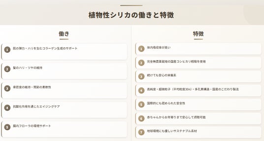 なお、本製品に先行して植物性シリカ配合の化粧品シリーズも販売中です。ヒト幹細胞培養液をはじめ美容成分との相乗効果で、コラーゲン・ヒアルロン酸合成促進や肌のハリ・潤いサポートに着目した設計となっており、内外両面からのシリカケアが可能です。