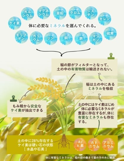 現代人の90%に一番不足しているミネラルといわれるシリカ(ケイ素)は、人体の全身に存在する重要なミネラルとして知られ、皮膚、髪、爪などのエイジングケアや骨、血管などの構成をする上で重要な役割を持ちます。それ故に美肌づくりや骨密度の維持、関節のケア、さらに抗酸化作用による老化予防など、体の内側から美容と健康維持に寄与する成分として世界的に注目を集めています。本製品はお米のもみ殻をアップサイクルして抽出した植物由来シリカを配合しており、環境にも身体にも配慮した持続可能な“飲む美容”習慣を提案します。