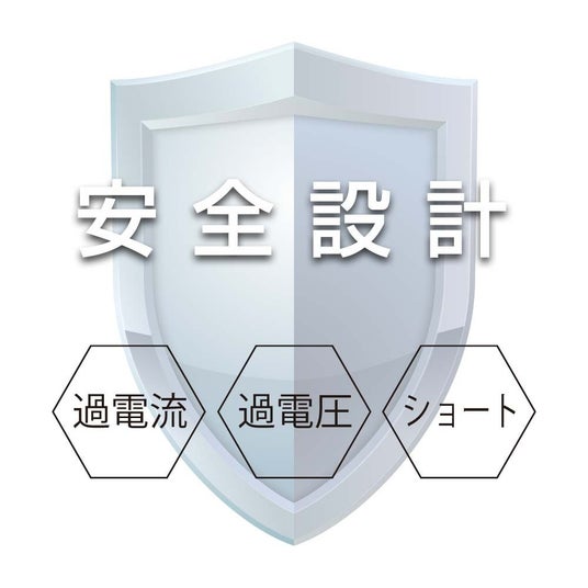 各種保護機能搭載の安心、安全設計保護機能の「過電流保護」「過電圧保護」「短絡(ショート)保護」を搭載し、高い安全性を備えています。過電流・過電圧・短絡(ショート)発生時に動作を止めることで、万が一の事故を未然に防ぎます。