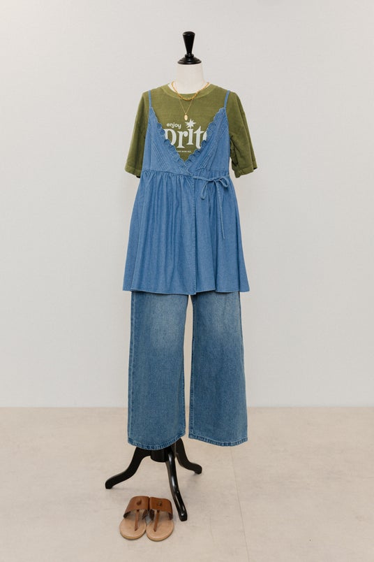 ワンパターンになりがちなデニムスタイルには、キャミソールのレイヤードがおすすめ!同素材を合わせてセットアップのようなスタイリングが楽しめます。