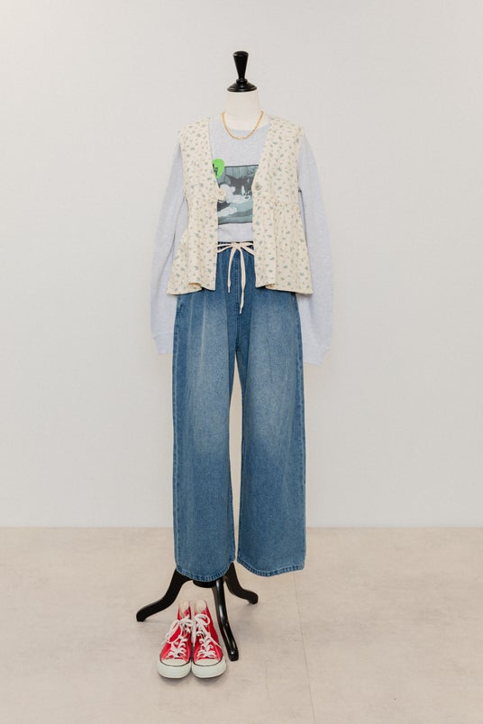 秋口になったらスウェットと合わせて思いっ切りアメカジを楽しみたい。今年は、フレアシルエットや花柄をプラスしたワークベストを使ったMIXコーデも注目です。