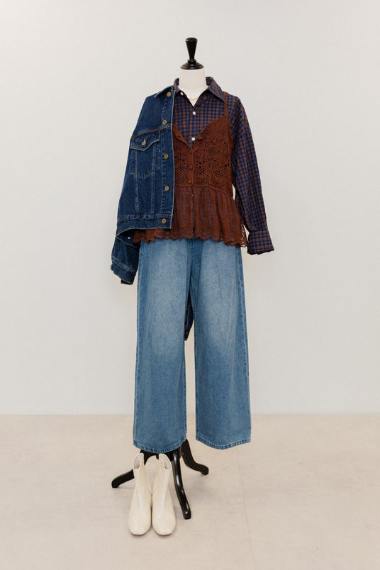 冬仕様にするにはまだ早い端境期には、ジャケットを合わせてデニムセットアップコーデ。レースアイテムを挟むことで軽さのあるスタイリングにまとまります。