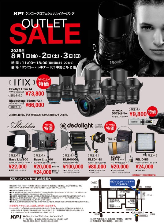 株式会社ケンコープロフェショナルイメージング(代表取締役社長:石川 博生)は、2025年8月1日(金)・2日(土)・3日(日)、東京中野の本社ビル2階サービスショップにて、アウトレットセールを開催します。