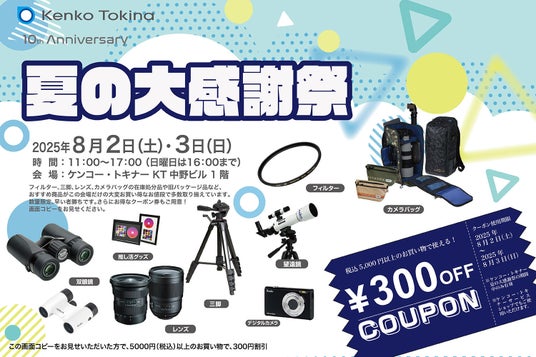 株式会社ケンコー・トキナー(本社:東京都中野区 代表取締役社長:櫻井 匡)は、2025年8月2日(土)・3日(日)、ケンコー・トキナー KT中野ビルにて『夏の大感謝祭』を開催いたします。