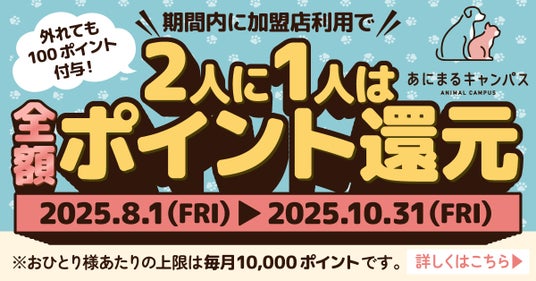 【2人に1人全額ポイント還元】あにまるキャンパスで8月1日(金)より開始!