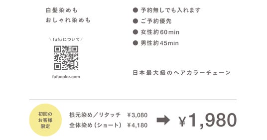 fufuを初めてご利用いただく方全員に、根元染め(リタッチ)税込3,080円または全体染め(ショート)税込4,180円を、税込1,980円でご提供いたします。