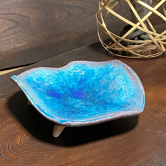 独特の形状に、紅の釉薬とトルコ釉とのコラボレーションが美しい器です。