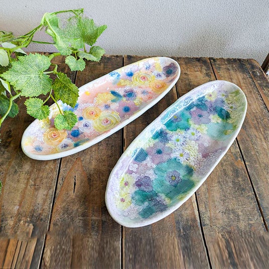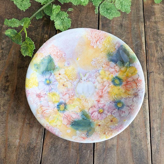花や動物をモチーフに、花弁を化粧土で描き、下絵の具と、「いっちん」という、線文を描く技法を用いた、色彩豊かで立体感のある作品を制作しています。