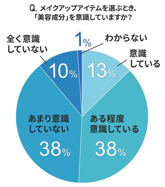 一方、メイクアップアイテムについては「意識している」が13%で、「ある程度意識している」と「あまり意識していない」がそれぞれ38%でした。メイク選びの時には、スキンケア選びほどは成分が重視されていないようです。
