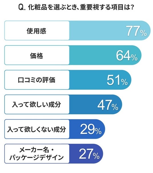 化粧品選びで重視する項目は、使用感が77%でトップ。価格が64%であったのに対して、47%が「入ってほしい成分」と回答。「入ってほしくない成分」を重視すると答えた人も29%いることを考えると、成分を重視する人は76%で、成分は価格以上に重視されていることがわかりました。