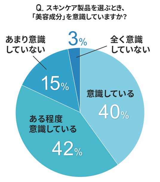 「スキンケア製品を選ぶとき、『美容成分』を意識していますか?」との質問に対して、「意識している」40%、「ある程度意識している」が42%と、8割以上が美容成分を意識していると回答しました。成分を全く意識していない人は3%と少なく、成分への注目度の高さがわかります。