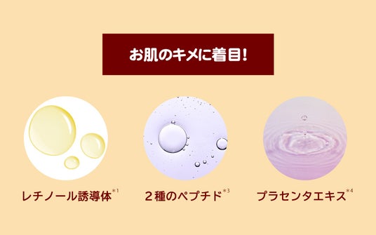 レチノール誘導体*¹を2倍配合*²。さらに2種のペプチド*³とプラセンタエキス*⁴がお肌のキメを整えます。