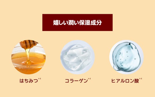 (※1 ジ酢酸ジペプチドジアミノブチロイルベンジルアミド・パルミトイルトリペプチド-5、はちみつ、グリチルリチン酸ジカリウム(保湿成分))