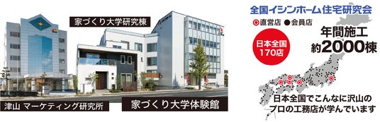 イシン住宅研究所は、岡山県津山市で誕生し、今では全国170の加盟店を持つ住宅フランチャイズチェーン「イシンホーム」の本部として、年間2,000棟の住宅建築を支えています。