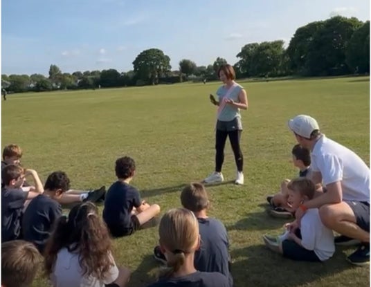 ミニ駅伝イベントにて、イギリスの小学生に駅伝の想いや楽しさを自ら伝える鎌田