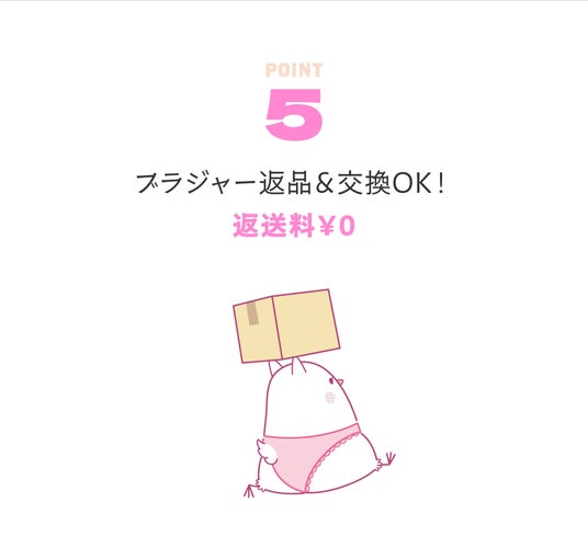 POINT5:ブラジャー返品&交換OK。さらに返送料¥0ネットでのお買い物で気になるサイズや着用感などの不安を解消できるよう、SHIROHATOでは返送料¥0でブラジャーの返品&交換を受け付けております。安心して気になる商品をお買い求めください。