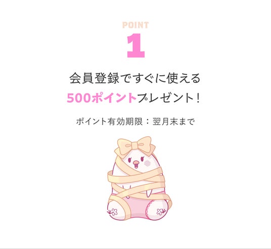 POINT1:会員登録ですぐに使える500ポイントプレゼントポイント以外にも、初めての会員登録で使えるクーポンや、お誕生月に使えるクーポンなども配布中♪