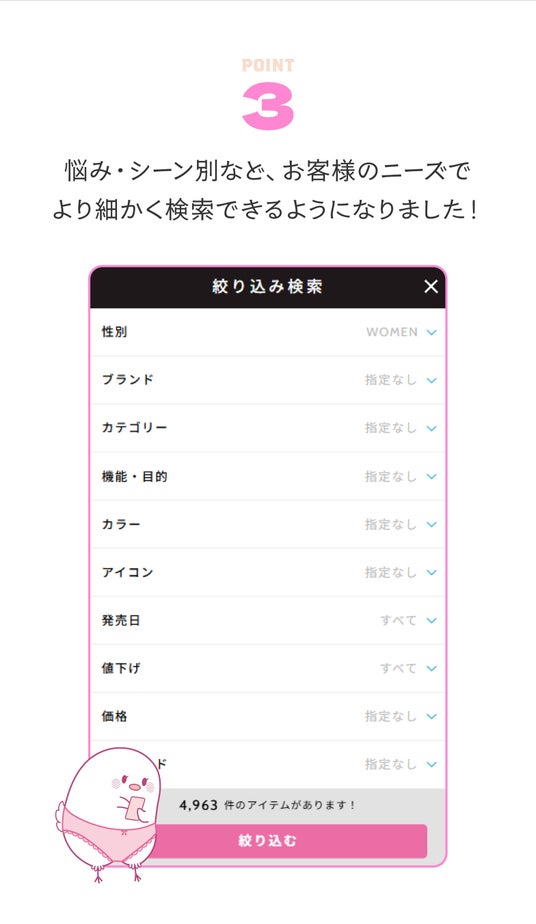 POINT3:お客様のニーズでより細かく検索できるようになりました。お悩みやシーン別など、様々な条件を組み合わせて商品を検索することが可能になりました。