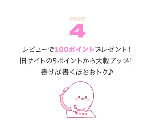 POINT4:商品購入後のレビュー投稿で100ポイントプレゼント旧サイトの5ポイントから大幅に付与ポイントを拡大いたしました。