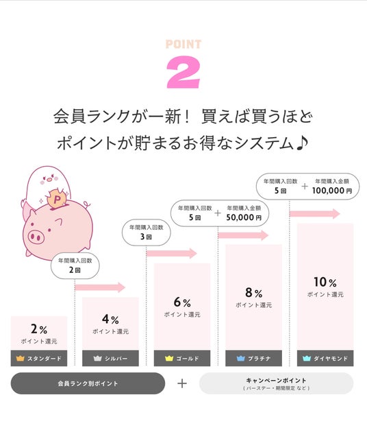 POINT2:お買い物をすればするほどポイント還元率アップ会員ランクが一新され、買えば買うほどポイントの還元率がアップ。