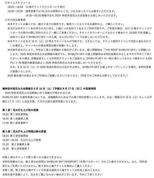 ※チケット販売開始日時以降に上記URLより注意事項をご確認の上、特別チケット「THE ROOF SHIBUYA SKY2025 神宮外苑花火大会特別シート」をご購入ください。