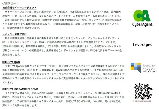 本イベントの踊り手として、渋谷スクランブルスクエアから株式会社サイバーエージェント、レバレジーズ株式会社、SHIBUYA QWSが参加。一人ひとりの夢が、踊りというかたちに姿を変え、天空へと昇華させます。