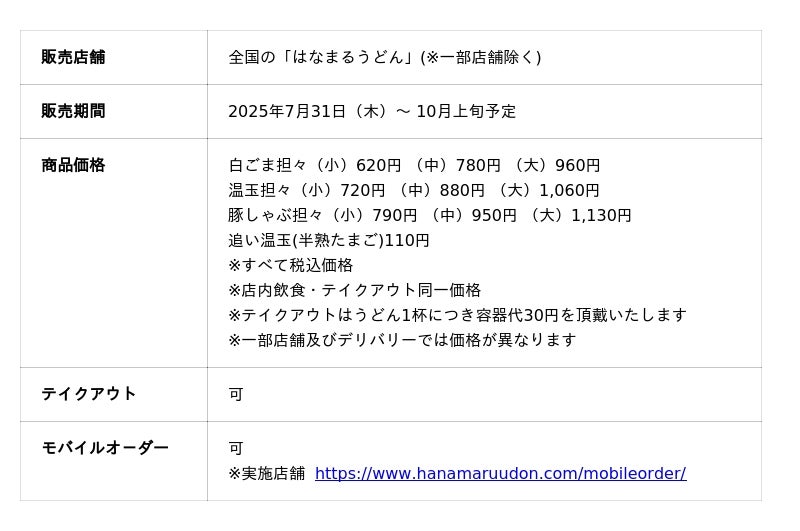 讃岐うどんチェーン「はなまるうどん」を展開する株式会社はなまる(本社:香川県高松市、代表取締役社長:前田良博)は、2025年7月31日(木)より、全国の「はなまるうどん」(※一部店舗を除く)にて、毎年ご好評いただいている「冷やし担々」3種を夏季限定で販売開始いたします。