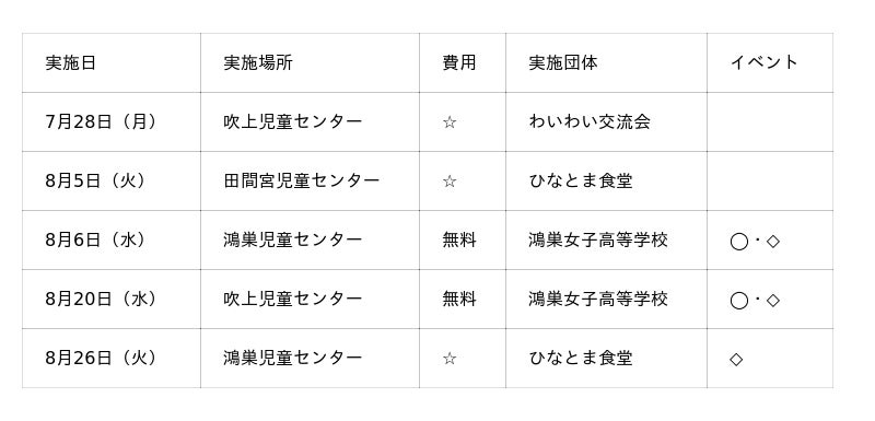 鴻巣市の「出張こども食堂」(https://www.city.kounosu.saitama.jp/page/33847.html#event )は、給食がない夏休み期間中に、お子さんたちの「お昼ご飯を1人で食べている」「食べるものがない」などの不安を取り除くことを目的に実施される取り組みです。鴻巣市内の児童センターを会場に、埼玉県立鴻巣女子高等学校や、市内こども食堂運営団体により実施されます。