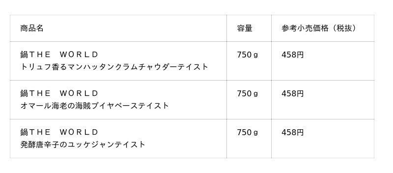 鍋THE WORLDは、「世界中の素敵な文化や料理のエッセンスを、鍋に取り入れてみたら?!」という自由な発想から生まれた、世界を体験できる新しい鍋つゆシリーズです。いつもの鍋具材でも、鍋THE WORLDを使用すれば“世界らしさ”を感じる特別な美味しさをお楽しみいただけます。その秘密は、単に現地の料理の味を再現したのではなく、現地の文化や情景に想いを馳せながら、現地らしさを感じられる新たな味わいを生み出した“妄想架空鍋スープ”だからです。鍋THE WORLDは、毎日の食卓を楽しく、おいしく豊かに彩ります。●鍋THE WORLD トリュフ香るマンハッタンクラムチャウダーテイスト