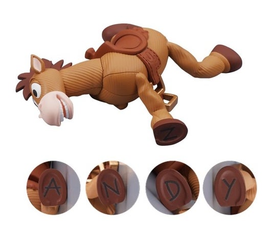 サニーサイド保育園にて、ブルズアイにもたれかかりながら倒れこむジェシー。デニムの細かい質感や綺麗な三つ編みヘアにこだわりました。足の裏の「ANDY」の文字や、表情にもご注目ください。帽子は着脱が可能で、背中の下に置くことで単体でも飾ることが可能です。