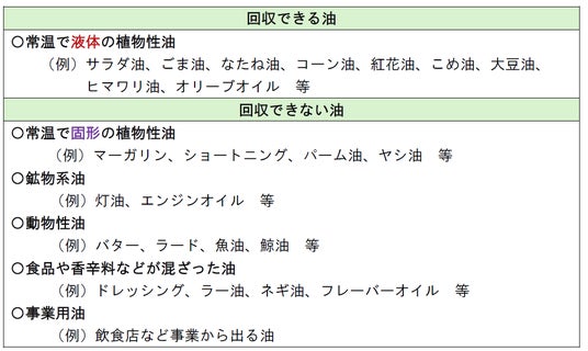 SAF原料として回収できる油は、常温で液体の植物性油です。植物性油でも常温で固形の油は回収できません。回収できる油、回収できない油については下表をご参照ください。