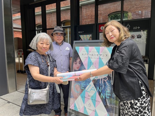 三菱一号館美術館(東京・丸の内)にて開催中の「オランジュリー美術館 オルセー美術館 コレクションより ルノワール×セザンヌ―モダンを拓いた2人の巨匠」展(以下、「ルノワール×セザンヌ」展 主催:三菱一号館美術館、オランジュリー美術館、オルセー美術館、日本経済新聞社)は、ご好評をいただき、開幕から58日目の7月31日(木)に来場者数10万人を突破しました。これを記念し10万人目のお客様へ、三菱一号館美術館・館長の池田祐子より記念品(「ルノワール×セザンヌ」展ポスター、図録、15周年アクリルキーホルダー)を贈呈しましたのでお知らせします。
