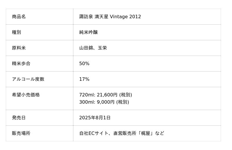 当社は、「諏訪泉 満天星 Vintage 2012」を通じて、日本酒が持つ計り知れない魅力と可能性を世界に発信してまいります。今後も、最高品質の日本酒製造に情熱を注ぎ、熟成酒の研究開発にも尽力し、お客様の心に深く刻まれる感動的な長期熟成酒を提供し続ける所存です。具体的には、年内中に当社のフラグシップである「鵬 (おおとり) 」のVintageや、30年以上の熟成を経た諏訪泉を提供していく予定です。
