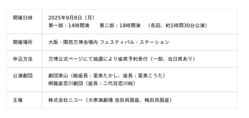 大衆演劇場「旅芝居の名門 呉服座」を運営する株式会社ニコー(本社:大阪市北区、代表取締役社長:山崎理史)は、2025年9月8日(月)、EXPO2025 大阪・関西万博にて大衆演劇の祭典『龍王祭』を開催いたします。会場はフェスティバル・ステーション(318席)、出演は「劇団美山(総座長:里美たかし、座長:里美こうた)」および「桐龍座恋川劇団(座長:二代目恋川純)」、公演は14時からと18時からの2回(各約1時間30分公演、内容は同一)となります。万博公式ページにて順次抽選により座席予約を実施中(一部、当日席あり)。また、当日は会場にて万博限定『龍王祭』オリジナルグッズの販売も予定しております。
