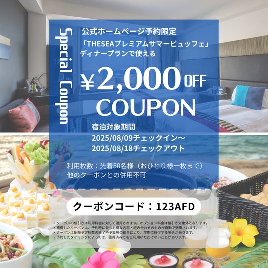 カレー&ハワイアン料理が食べ放題!「THEseaプレミアムサマービュッフェ」付き宿泊プランが、公式ホームページからのご予約限定で2,000円OFFクーポンを配布するキャンペーンを実施しております。