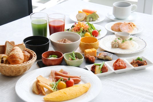 朝食は焼き立てのパンや、ヨコハマ名物「シューマイ」などの和洋中バラエティ豊かなメニューラインナップ。シェフがお客様の目の前で作るオムレツなど和洋中の様々なお料理から、お好みのボリュームでお愉しみいただけます。