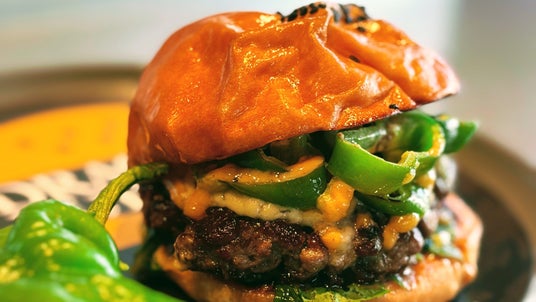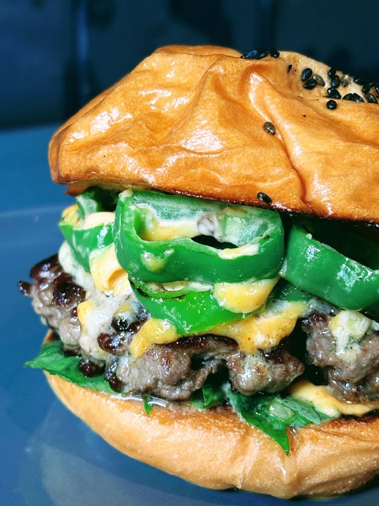 京都で3店舗を展開する「DRAGON BURGER」(運営:株式会社PADDLE)は、京都の夏野菜「万願寺とうがらし」を主役にした新商品「万願寺BLUE」(1,800円・税込)を、2025年8月1日(金)から期間限定で販売します。 ロンドンでベストバーガーの受賞歴を持つシェフ、アダム・ローソン氏が、京都府南丹市の北井農園が栽培する甘くて柔らかい万願寺とうがらしと、イタリア産ゴルゴンゾーラチーズ・特製のガーリックマヨを大胆に組み合わせました。 地元の生産者との出会いから生まれた、地産地消で京都を元気にするハンバーガーです。