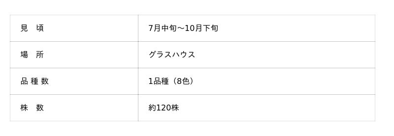 「グラスハウス」では、暑い日でも室内で涼をとりながら、サンパチェンスを快適にお楽しみいただけます。併設する「Sea Side Cafe」では、和紅茶や軽食が等のメニューを取り揃えています。まるで海へと続くような花風景を、お好みのドリンクとあわせてお楽しみください。