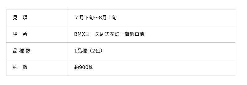 みはらしの丘では、爽やかなライムグリーンのコキアが成長中です。現在約30~40cmのコキアは、真夏の日差しを浴びて8月中には“ふわふわ”とした大きく丸い形状で約70cmに成長します。また、丘のふもとでは多彩なカラーバリエーションが魅力の「ジニア」が5分咲きを迎え、8月中旬ごろになると、夏空に映える「ヒマワリ」なども見頃を迎えます。