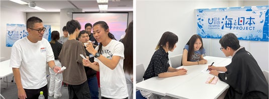 続いて、プログラム参加者の交流を目的としたワークショップでは、「海」をテーマにした相互インタビューや、チームメンバーの共通点を探すゲームを通じて、同じプログラムに取り組む仲間への理解と親睦を深めました。本プログラムに参加する高校生は出身地も学年も異なり、全員がこの日初めて顔を合わせましたが、ワークショップが始まると高校生と指導者が一体となり、会場は大いに盛り上がりました。