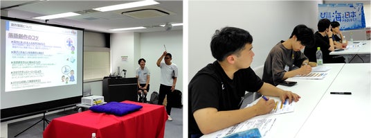 参加者同士で親睦を深めた後、海落語とアクティブラーニングに取り組むための実践的な講義が行われました。落語家・三遊亭朝橘さんからは、落語を創作するための基本的な作法や技術に加え、海落語ならではの考え方についてのレクチャーがありました。演者も聴き手も想像しやすいキャラクターやストーリーを組み立てつつ、海の問題を笑いに変換して伝える「海落語」には、特に独創的なアイデアが求められるとのことです。続いて行われた井手迫先生の海洋講義では、「海洋温暖化」と「漁業資源」について学習。高校生たちは真剣な表情で授業に取り組み、早速、今後の研究や創作について考えを巡らせている様子でした。