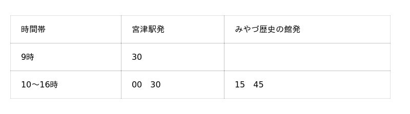 宮津駅とイベント会場のみやづ歴史の館の間にて、シャトルバスを運行します。時刻表につきましては以下の通りです。