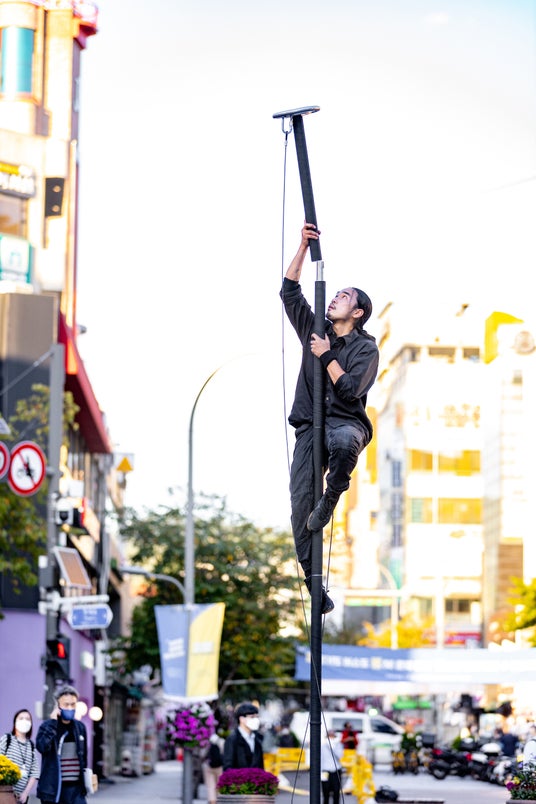 《ポロシウム》はポールとコロシウムを組み合わせた造語で、観客参加型サーカスパフォーマンスです。ポールを立てるというシンプルな目的を達成するため、パフォーマーも観客も一連のプロセスを経験することで、その間の境界は崩れていきます。《ポロシウム》は観客とともに作り上げていくものであり、その過程で起こる人間関係や協力、そして苦闘や失敗の瞬間など、そのプロセスそのものが重要です。それはまさに、人生の縮図です。