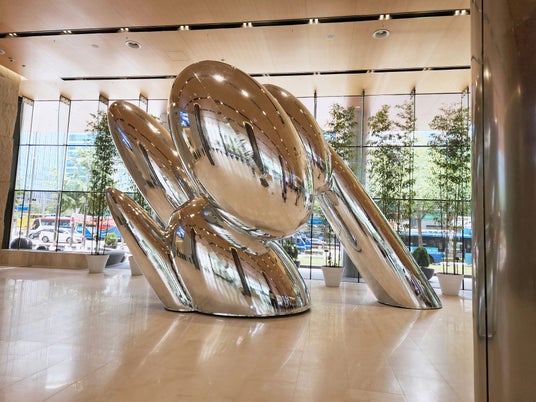 《Exo2_crop_xl》(2022年)をはじめとする作品群は、デジタルで生成された彫刻をアーティストが物理的に再現したシリーズです。見た目は金属のようで頑丈そうに見えますが、実際は空気で膨らませた風船でできていて、空洞であり、送風機の電源が切れて空気が抜けると形を保つことができなくなります。これらの作品群で、カンはこれまで物理的なものとしてのみ存在していた彫刻が、デジタル・テクノロジーの発展を受けて異なる大きさやメディアに進化する可能性を追及しているのです。