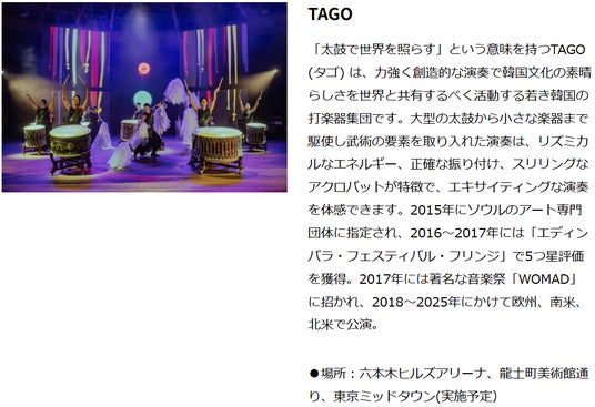 韓国の伝統芸能を現代的なセンスを活かして斬新なスタイルで受け継ぐパフォーマンスグループ「TAGO」。打楽器によるグループアンサンブルと躍動的な舞踊が一体となったそのステージは世界の舞台芸術の祭典「エディンバラ・フェスティバル・フリンジ」でも高い評価を受けるなど、世界各地で輝かしい注目を集めています。六本木ヒルズアリーナで会期中、毎日公演するほか、ほかの場所でも何度かミニパフォーマンスを行います。
