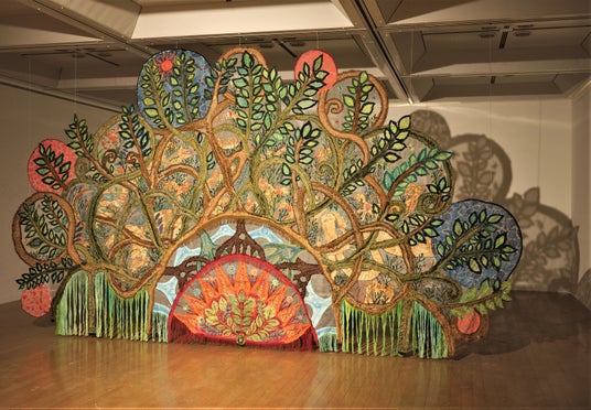 布、糸、和紙、粘土など多様な自然素材を用い、染めや刺繍によって動植物の生命の循環が空間全体で表現されます。あらゆる生命の源である水ですが、流れた水はどこへゆき、どのような旅を経て、私たちの元へ再びやってくるのでしょうか。水によってつながり繰り返される生命の営み、その物語の一片を想起させるインスタレーションです。