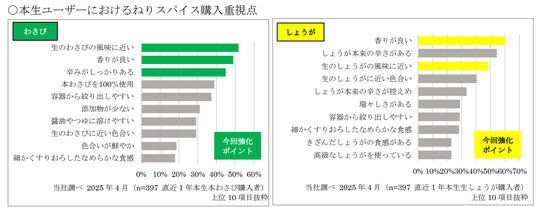 「本生」ブランドを購入している方は、チューブ調味料などのねりスパイスを購入する際に、「香りの良さ」や「素材本来の風味、辛み」などを重視していることがわかります。
