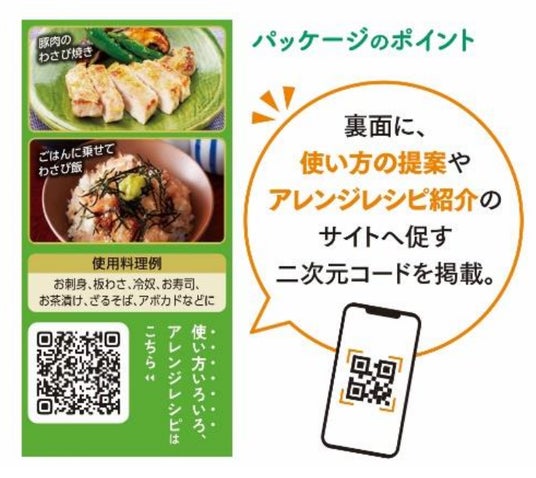 通常サイズの約2本分の容量でたっぷり使える、チューブ調味料の新シリーズです。パッケージ裏面には、薬味以外の多様な使い方や、アレンジレシピを紹介するサイトにつながる二次元コードを掲載しています。