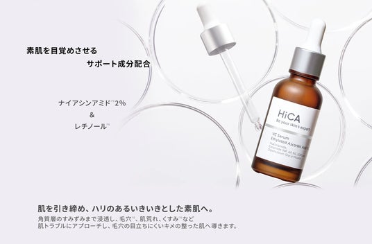 HiCAは「Be your skin’s expert」をテーマに成分の効果や濃度に着目した商品開発を進めるスキンケアブランド。速攻型VC誘導体(*1)配合de肌悩みを徹底ケア。
