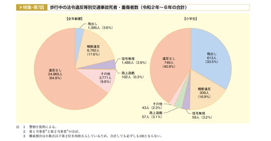 また、最新の令和7年版(2025年版)の交通安全白書によると、2020~2024年の5年間に『歩行中に死亡するか重傷を負った小学生』が1830人であったことがわかり、そのうち33.5%に当たる613人が「飛び出し」をしていたことが分かります。